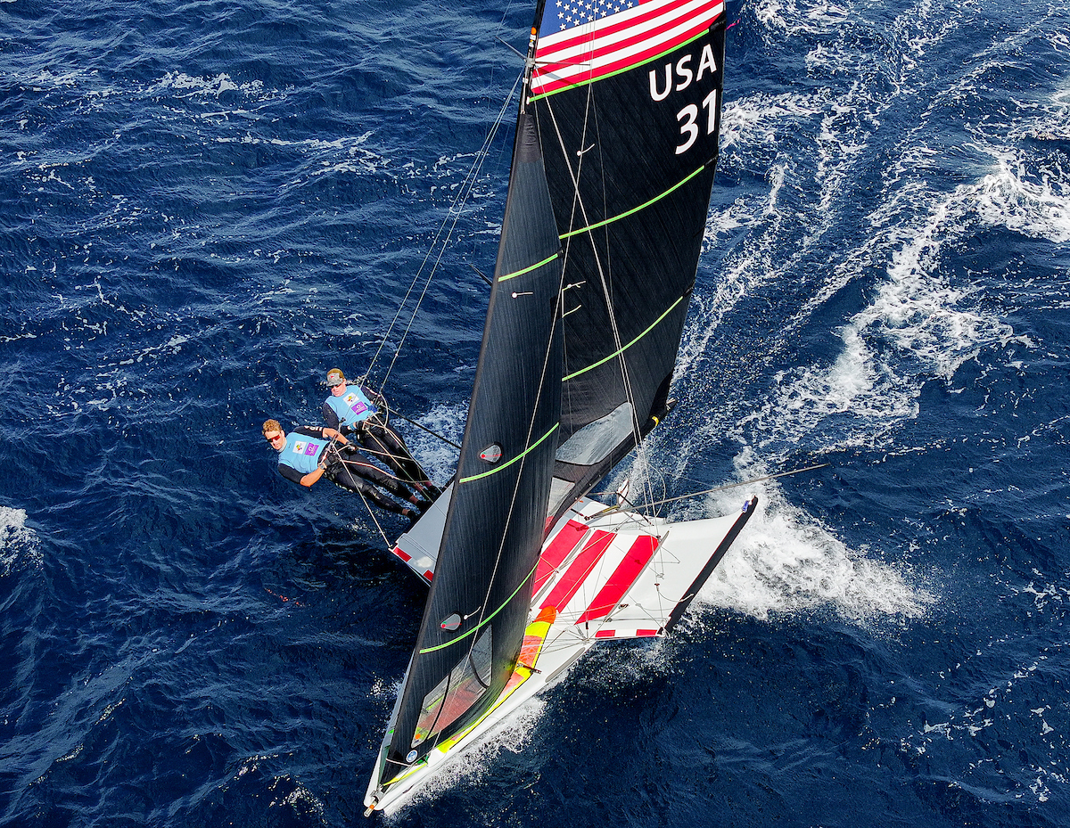 American pair Nevin Snow and Ian MacDiarmid lead the 49er fleet after a valuable recovery from an early start in second of the skiffs’ three races today. After having to return across the start line they battled to a 12th which they added to a race win and a fifth to lie just one point up on Germany’s Richard Shultheis and Fabian Rieger.