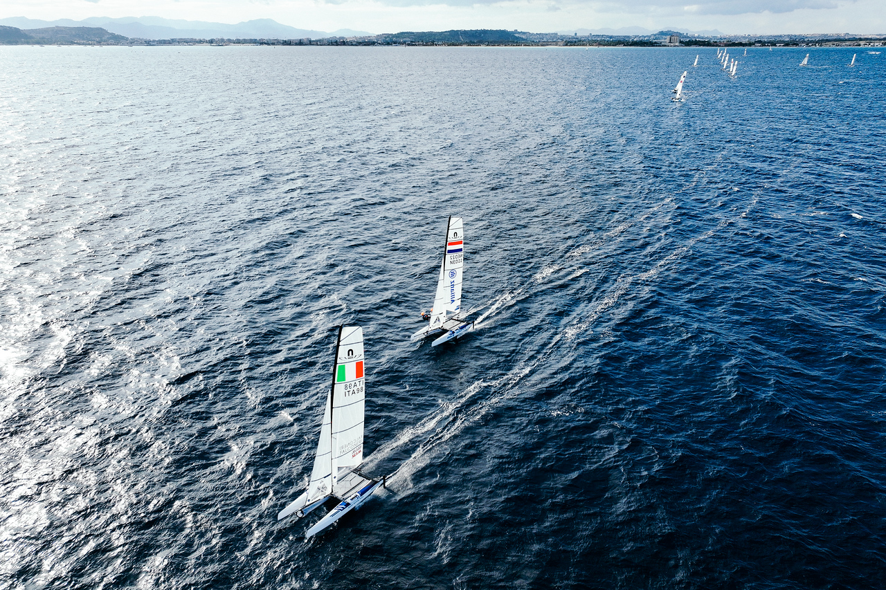 In both races the Italians were pushed hard all the way by the up and coming Dutch team, Willemijn Offerman and Scipio Houtman, who have risen from ninth to fourth overall and just two points behind the Turkish duo in third, Sinem Kurtbay and Alican Kaynar. Offerman was buzzing after their successful day on the bay of Cagliari in full-foiling conditions. “It was super nice to have such a speedy race and just push it to the limits and smash it out there,” she beamed.